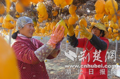 荆楚网(湖北日报网)消息(致欧阳君、范云杰)时值隆冬,柴湖镇黄茶底村100亩高标准瓜蒌瓜种植基地正忙着丰收。凉棚下,金黄色的瓜蒌瓜像灯笼一样悬挂着,忙碌着采摘瓜蒌瓜子的农民脸上洋溢着喜悦。