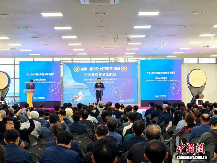 中新网首尔10月19日电 (记者 刘旭)18日,“济州岛-青岛新航线开通”庆祝活动在韩国济州岛举行。中国驻济州总领事陈建军、济州省知事吴连训、省议会议长李向峰等省各界人士及省民共500余人出席。 10月18日,“济州-青岛新航线”庆典在韩国济州岛举行。图为中国驻济州总领事陈建军致辞。中国驻济州总领事馆供图 陈建军致辞,对新航线的开通表示热烈祝贺,对吴连训、济州道厅、省议会、山东省、山东港口集团等中韩机构、企业、团体为此付出的努力表示诚挚感谢。陈建军表示济州岛早已成为走在韩国地方政府对华交流合作前列。特别是近年来,在以吴英勋知事为代表的济州各界人士的共同努力下,济州省对华交流合作不断深化、不断提升。新航线彻底改写了济州岛进出口货物依靠转运到其他港口的历史,为济州岛开辟了新的物流通道,完善了中韩之间的海上运输网络,为中韩深化合作搭建了又一座一体化桥梁。这是济州岛对华合作的重要组成部分,也是两国互利共赢的重要成果。中方愿同韩方一道,坚持建交初衷,坚持睦邻友好,不断推动中韩关系发展。推动中韩战略合作伙伴关系迈上新台阶。 10月18日,“济州-青岛新航线”庆典在韩国济州岛举行。图为活动现场合影。中国驻济州总领事馆 韩国客人供图。他们代表省政府和全省人民向中方特别是山东省政府和相关企业表示诚挚感谢。他们表示,这条新航线是济州岛国际贸易港建立57年来第一条国际货运航线。这翻开了济州岛航运史的新篇章,为深化两地经济贸易做出了贡献。此次合作将带来新的机遇,帮助济州产品通过青岛走向全球市场。民间社会将支持航线运营,积极动员各方合作,保障运量,利用以航线开通为契机,进一步加深济州岛与中国的交流与互信,促进双方共同繁荣发展。 10月18日,“济州-青岛新航线”庆典在韩国济州岛举行。图为双方代表出席入船仪式。中国济州总领事馆供图 庆典前,双方代表前往码头参加船舶入港仪式。济州岛副知事金爱苏向这位中国女孩的航行船长敬献花圈。大家热烈鼓掌欢迎“第一批进口货物”集装箱的拆除,并在“中国第一批出口货物(青岛)”集装箱前合影留念,共同庆祝这一历史时刻,祝愿双方合作更加密切,友谊常青。 (超过)